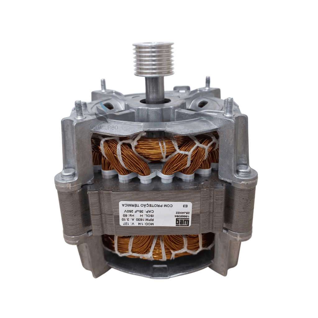 Se a placa é o cérebro, o motor é o coração da máquina de lavar. Ele gira a correia para que a transmissão movimente o agitador ou o cesto na centrifugação. Caso venha a queimar, a lavadora não lava e nem centrifuga, ou seja, não funciona.